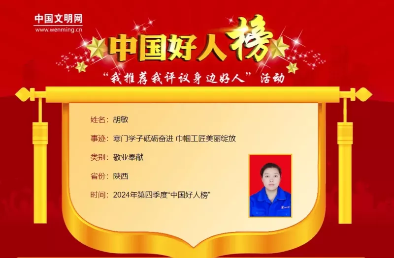 西安胡敏榮登2024年第四季度“中國好人榜”敬業奉獻“中國好人”!