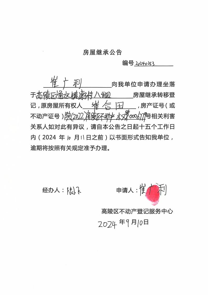 崔廣利房屋繼承公告 編號:20240253