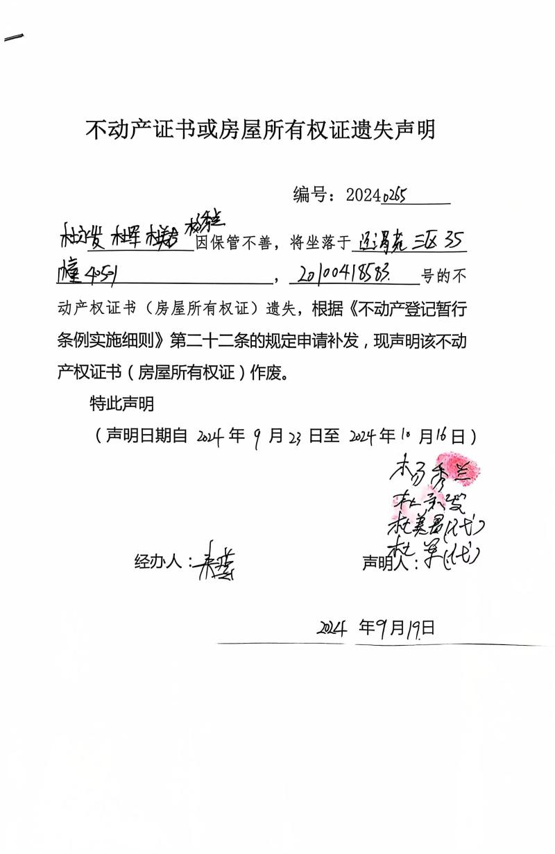 杜永發(fā)、杜軍、杜美君、楊秀蘭不動(dòng)產(chǎn)證書(shū)或房屋所有權(quán)證遺失聲明編號(hào):20240265