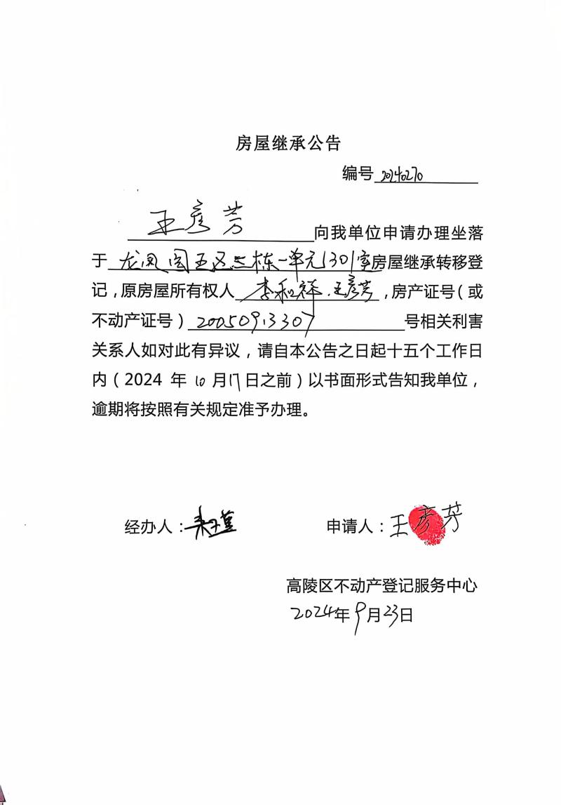 王彥芳房屋繼承公告 編號:20240270