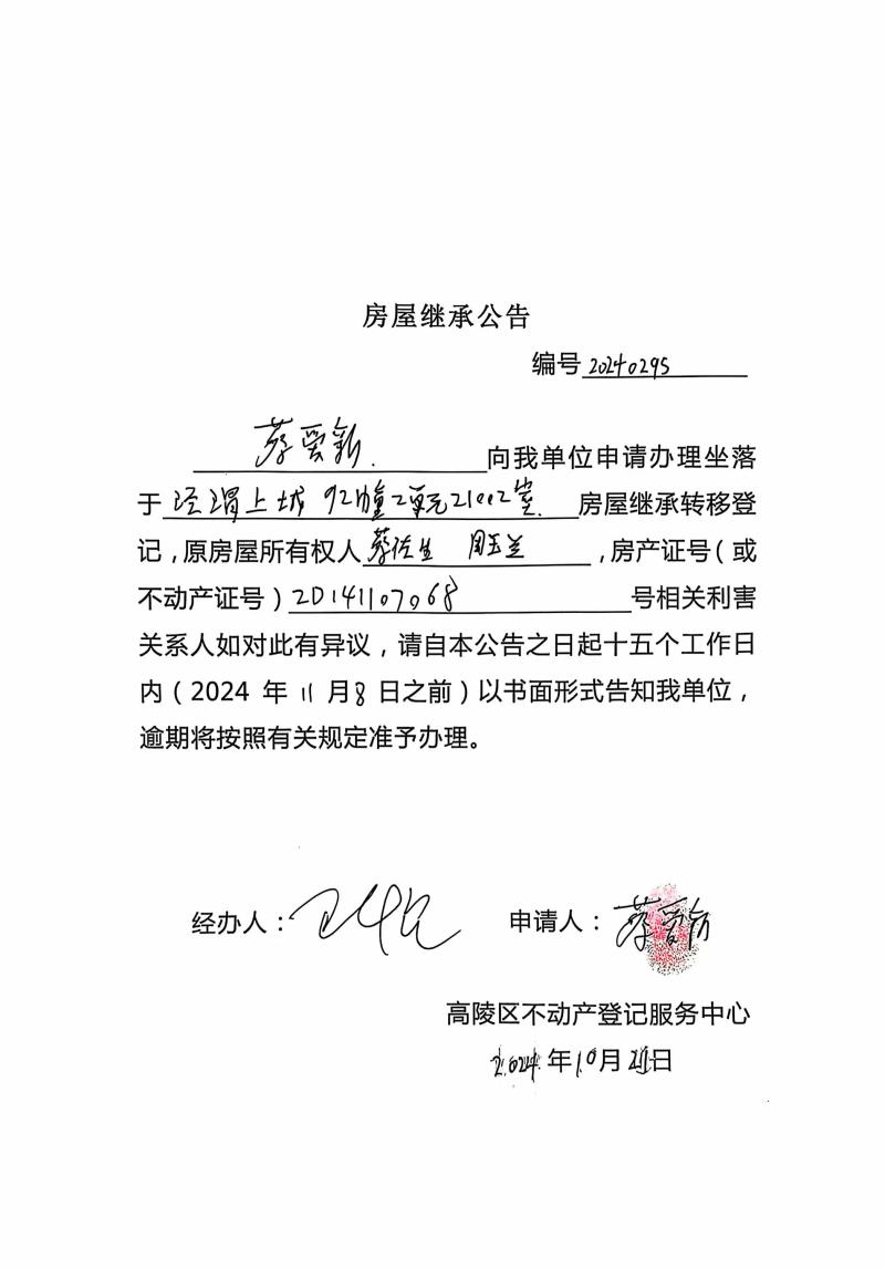 蔡愛新房屋繼承公告 編號:20240295