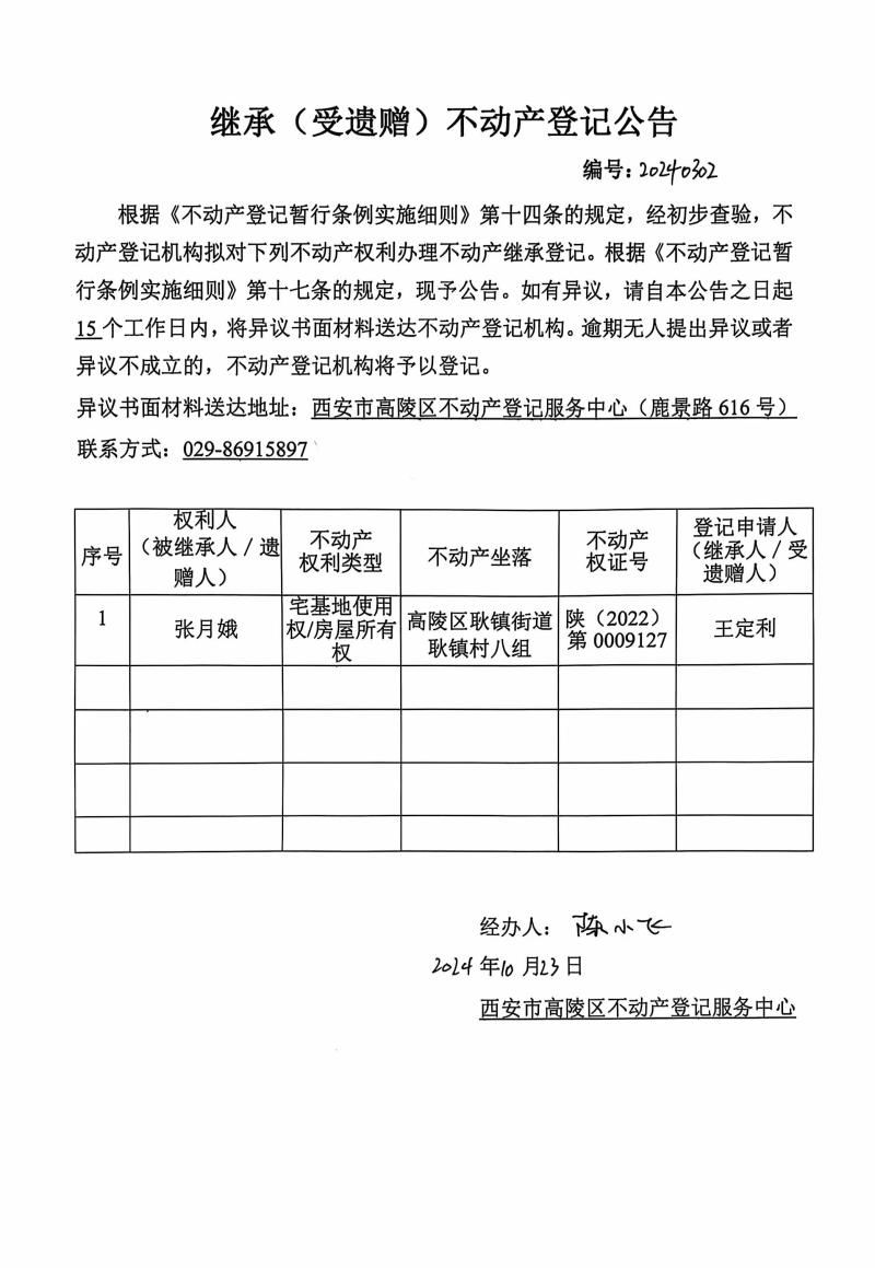 王定利繼承(受遺贈)不動產登記公告 編號:20240302