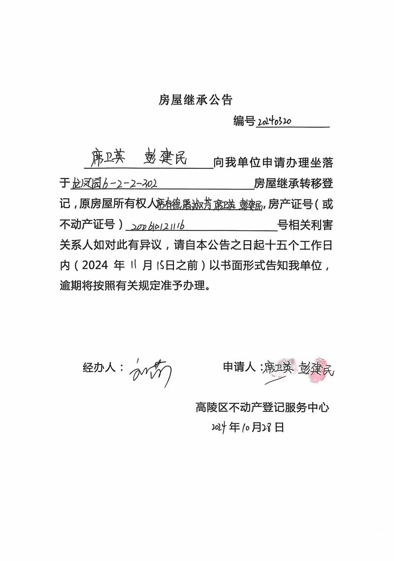 席衛英、彭建民房屋繼承公告 編號:202402320