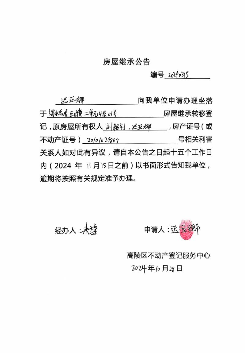 遲亞娜房屋繼承公告 編號(hào):20240315