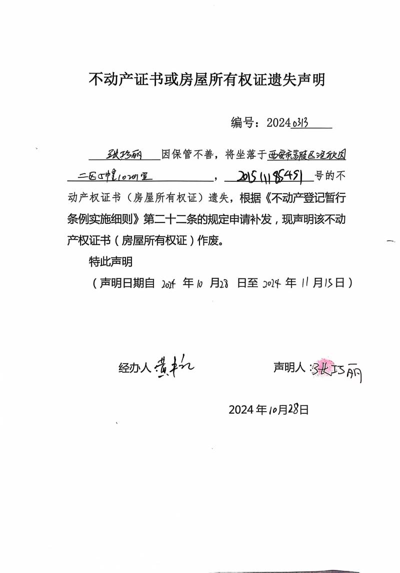 張巧麗不動產(chǎn)證書或房屋所有權(quán)證遺失聲明編號:20240313