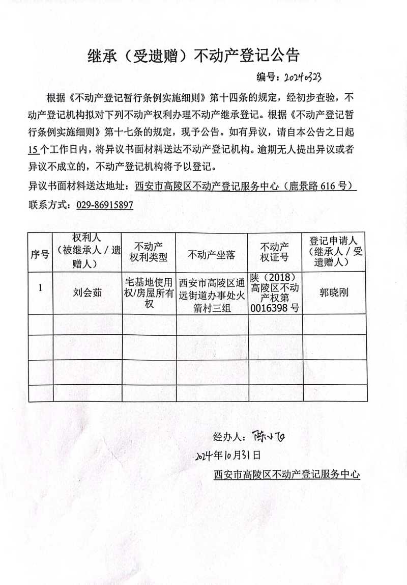 郭曉剛繼承(受遺贈)不動產登記公告 編號:20240323
