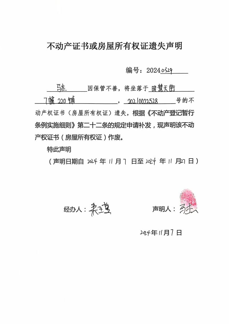 馬杰不動產證書或房屋所有權證遺失聲明編號:20240329