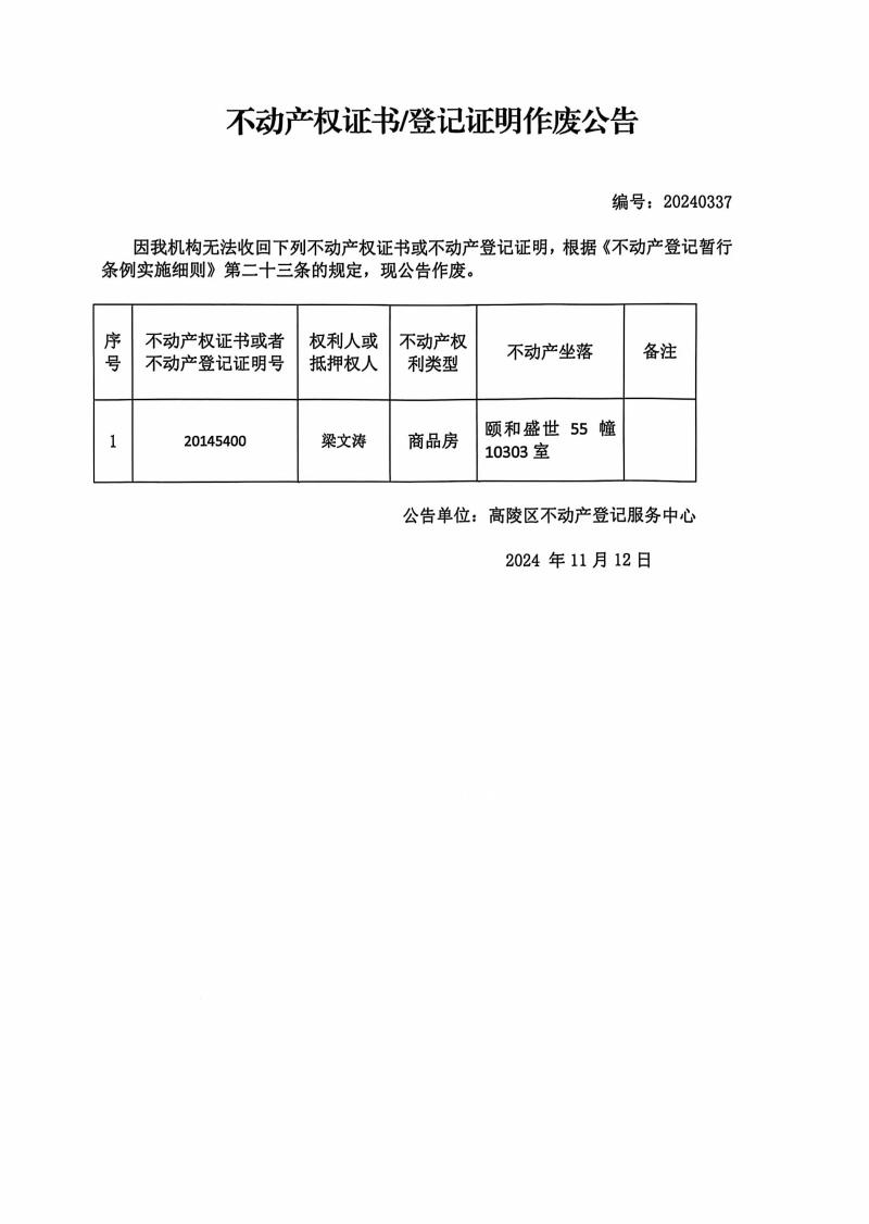 梁文濤不動產權證書/登記證明作廢公告 編號:20240337