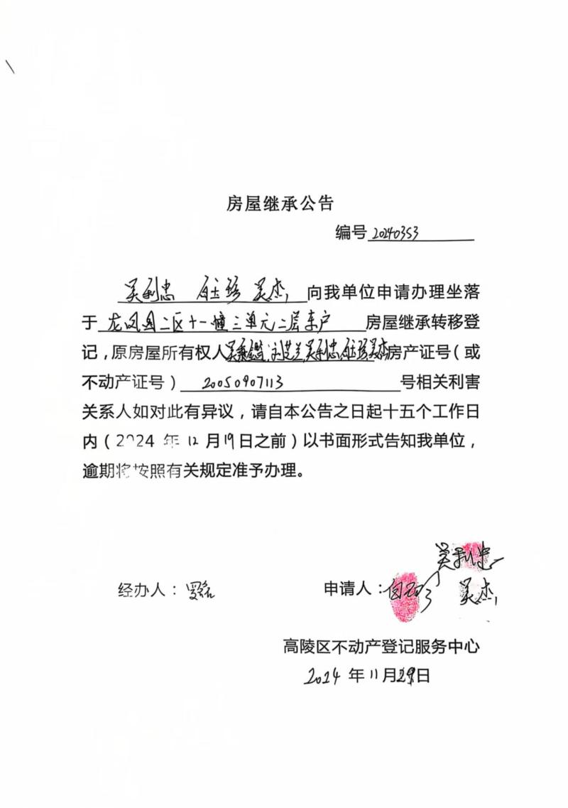 吳利忠、白玉珍、吳杰繼承公告,編號:20240353