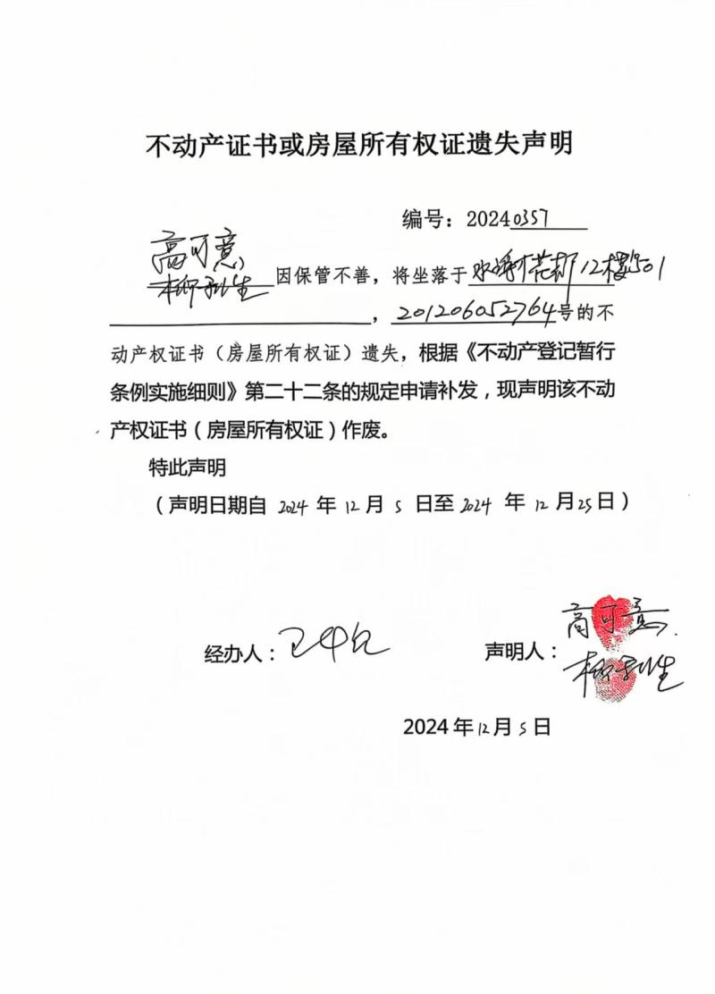 高可意、柳利生不動產證書或房屋所有權證遺失聲明,編號:20240357