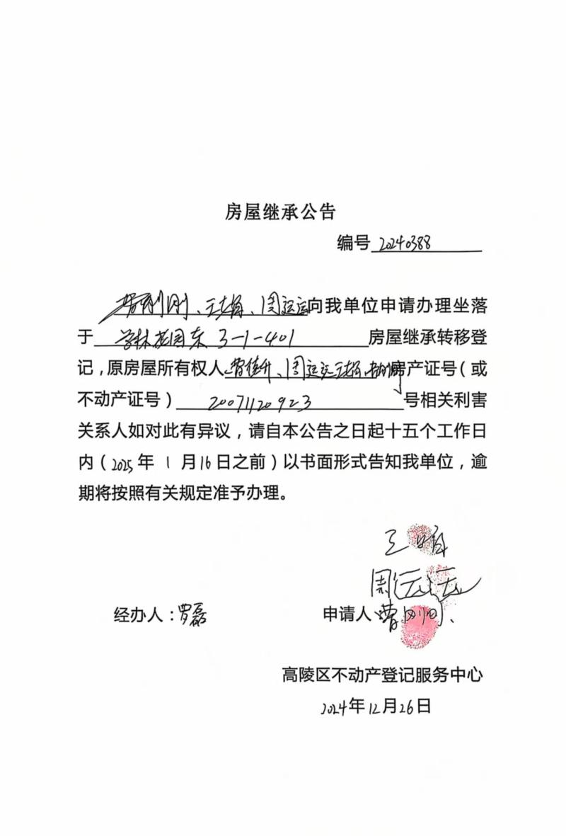 曹剛剛、王娟、周運(yùn)運(yùn)房屋繼承公告,編號:20240388