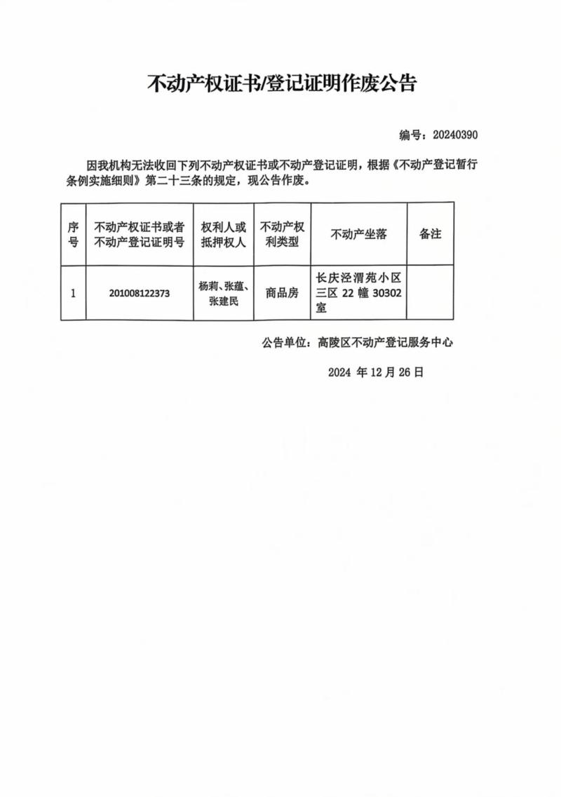 楊莉、張蘊、張建民不動產權證書/登記證明作廢公告,編號:20240390