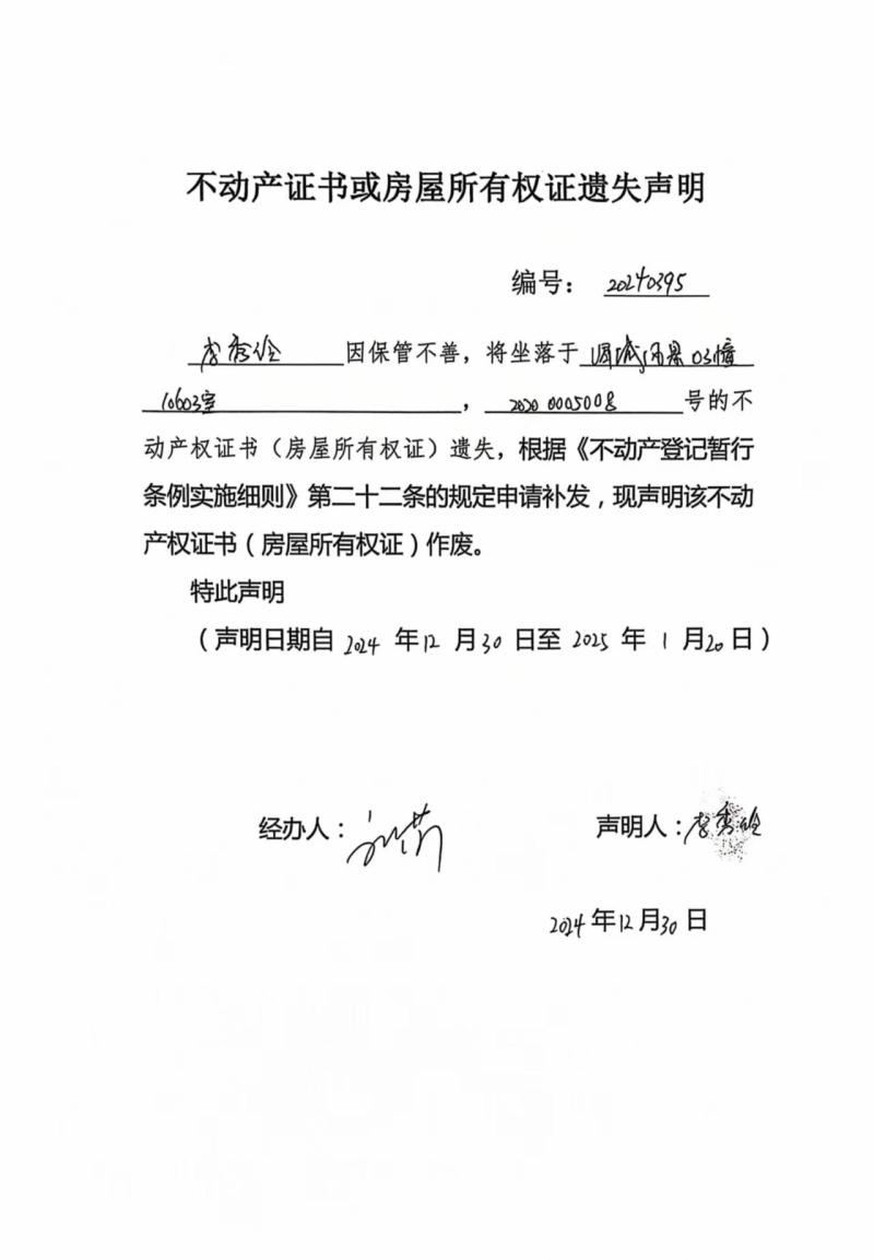 李秀玲不動產證書或房屋所有權證遺失聲明編號:20240395