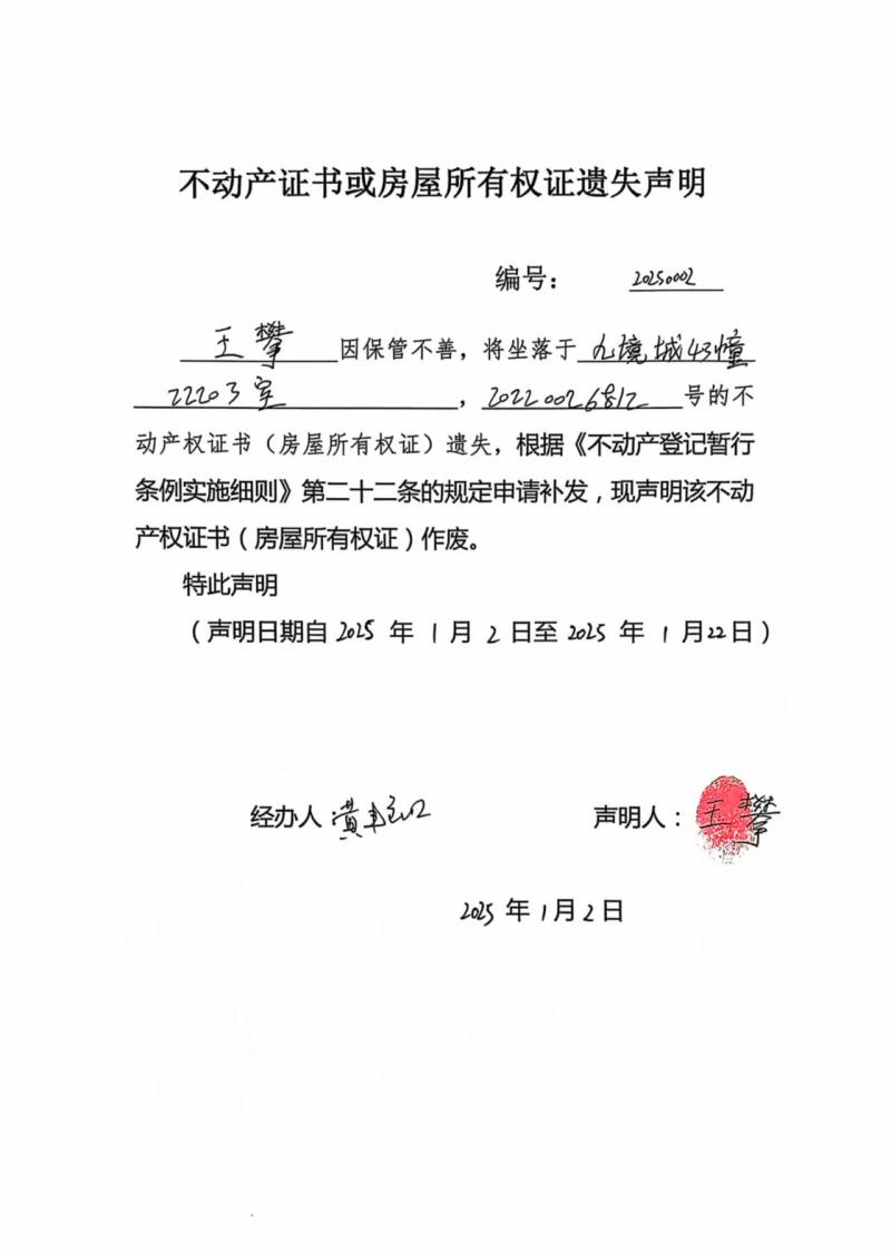 王攀不動產(chǎn)證書或房屋所有權(quán)證遺失聲明編號:20250002