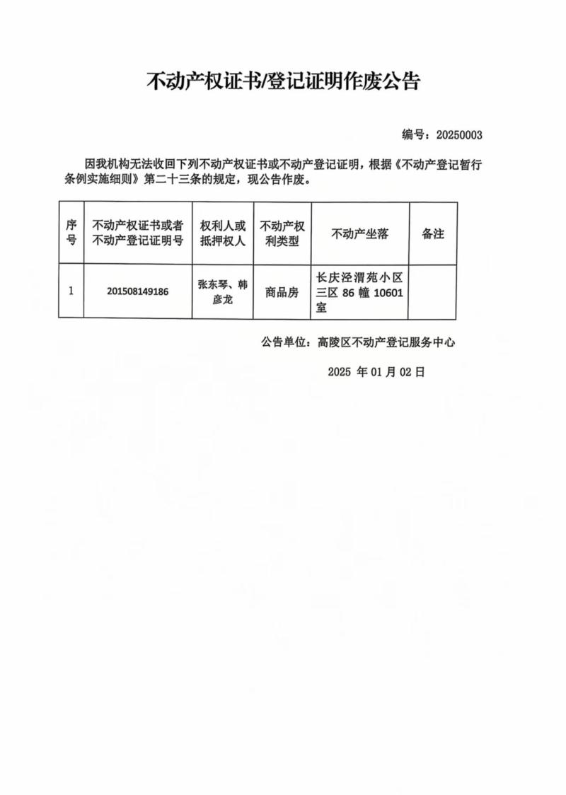 張東琴、韓彥龍不動產權證書/登記證明作廢公告,編號:20250003