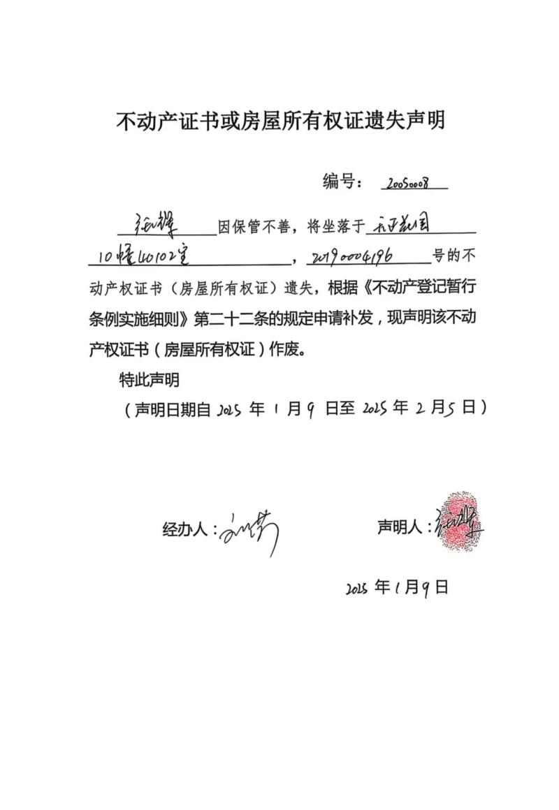 張輝不動產證書或房屋所有權證遺失聲明編號:20250008