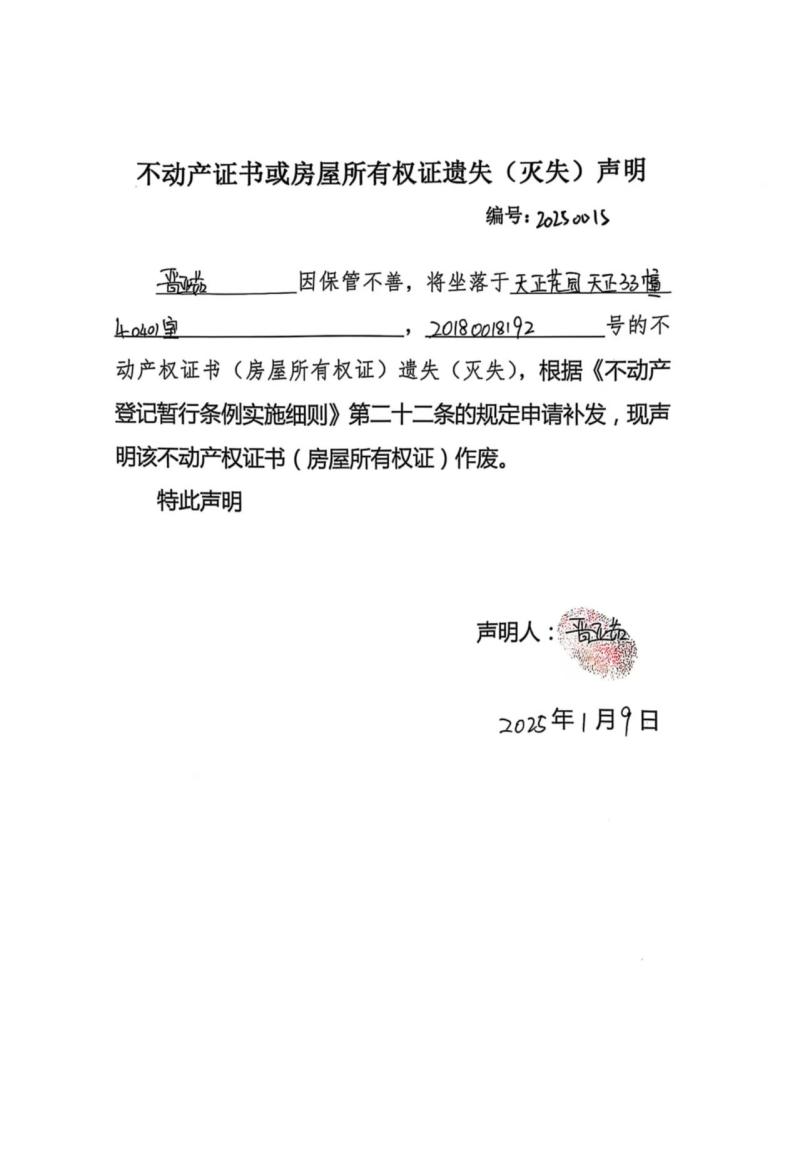晉亞茹不動產證書或房屋所有權證遺失聲明編號:20250015