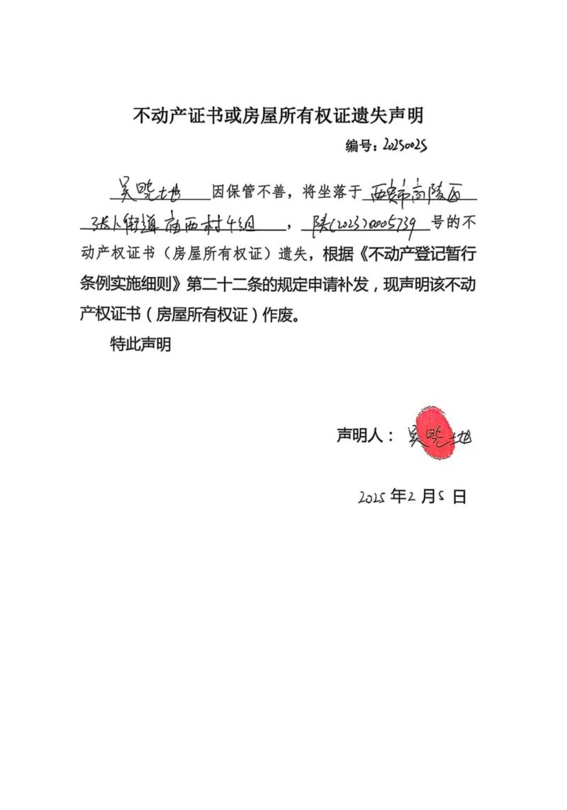 吳曉地不動(dòng)產(chǎn)證書或房屋所有權(quán)證遺失聲明編號(hào):20250025