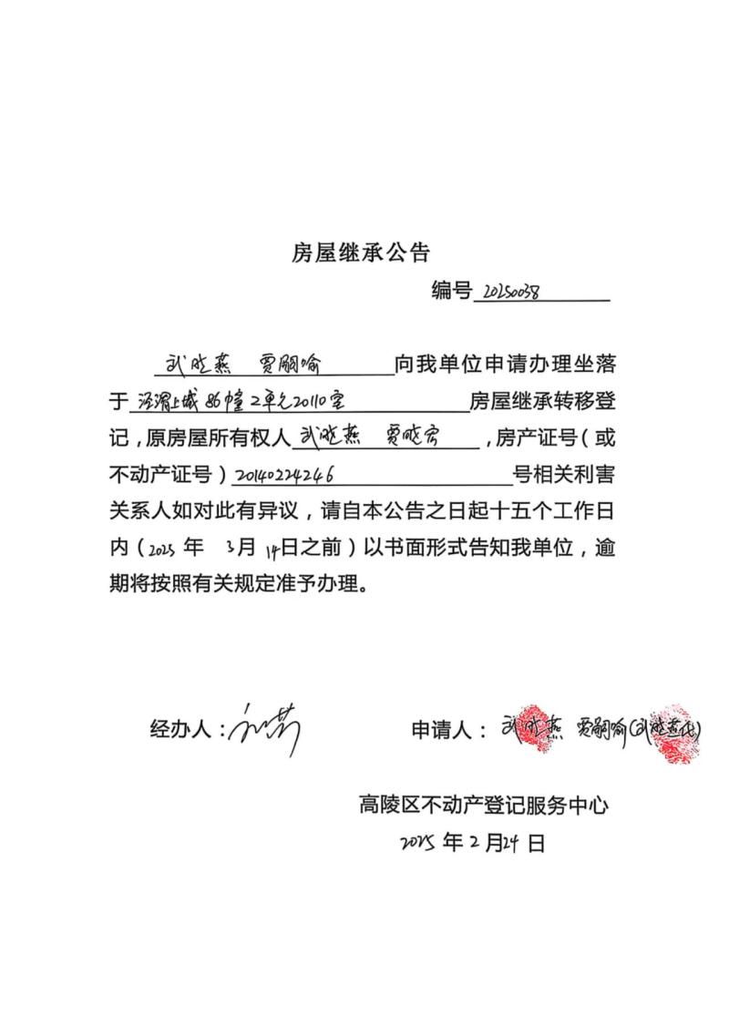 武曉燕、賈嗣喻房屋繼承公告,編號:20250038
