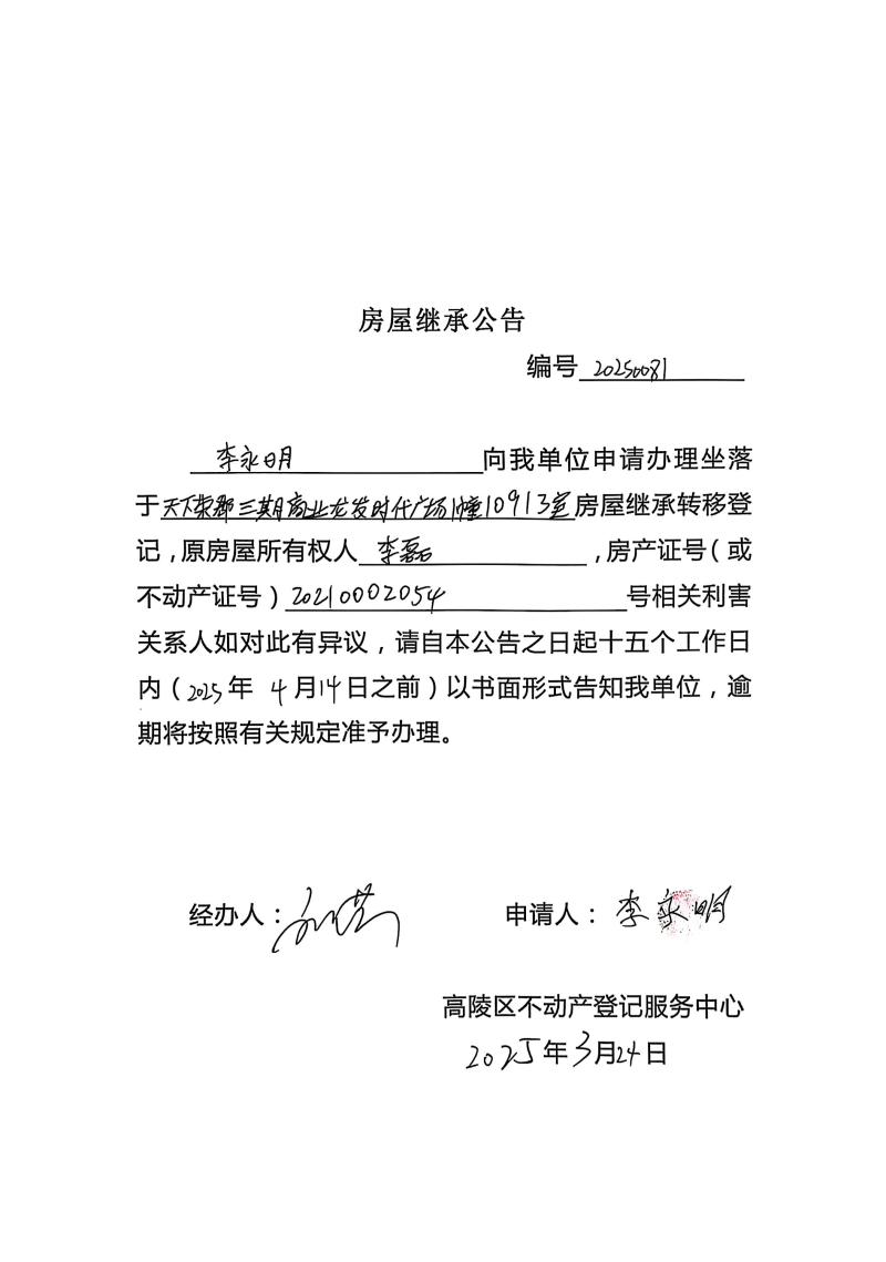 李永明房屋繼承公告,編號:20250081