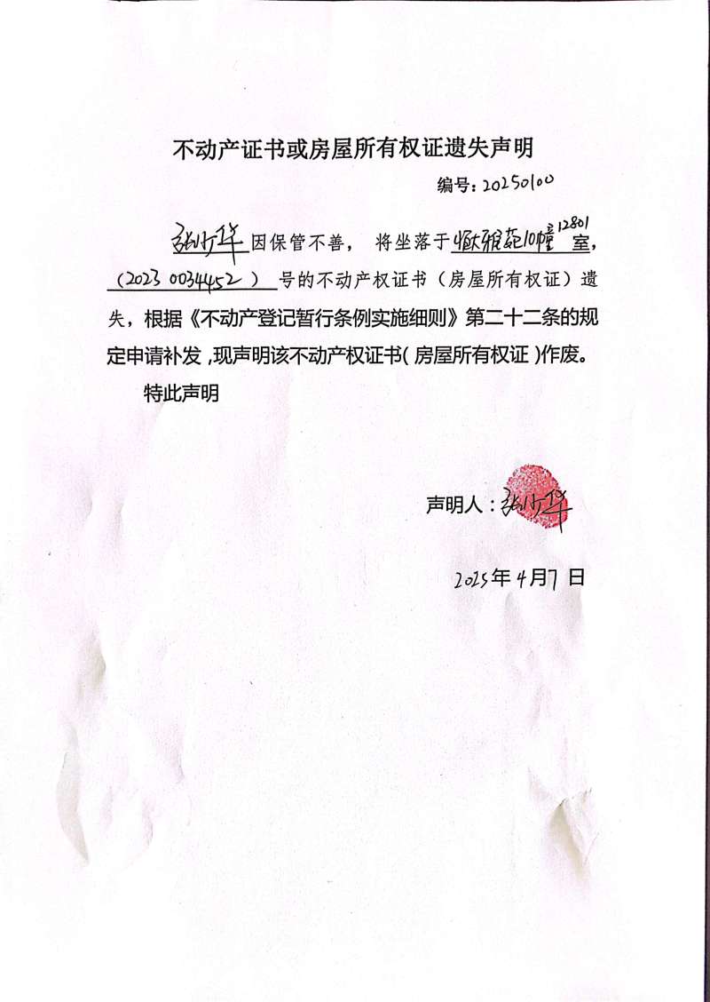 張少華不動產證書或房屋所有權證遺失聲明編號:202500100