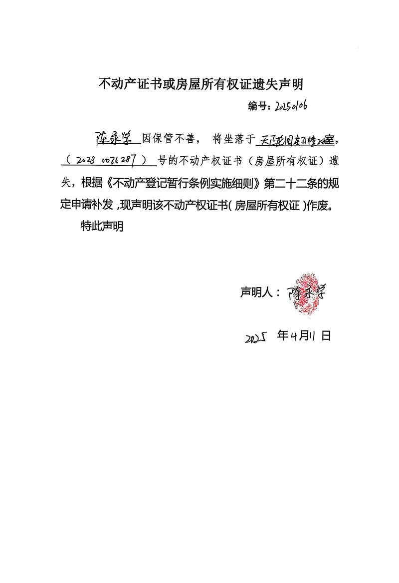 陳永學不動產證書或房屋所有權證遺失聲明,編號:20250106