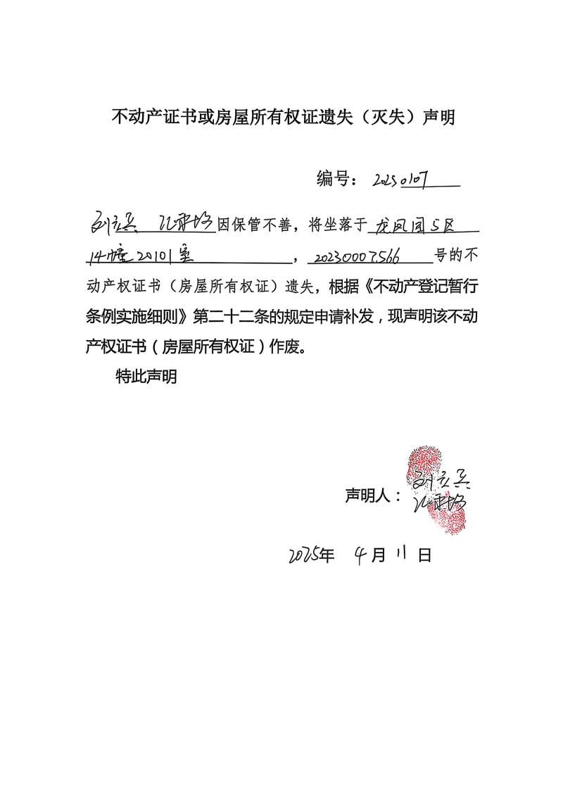 劉立兵、溫雪梅不動(dòng)產(chǎn)證書或房屋所有權(quán)證遺失(滅失)聲明,編號(hào):20250107