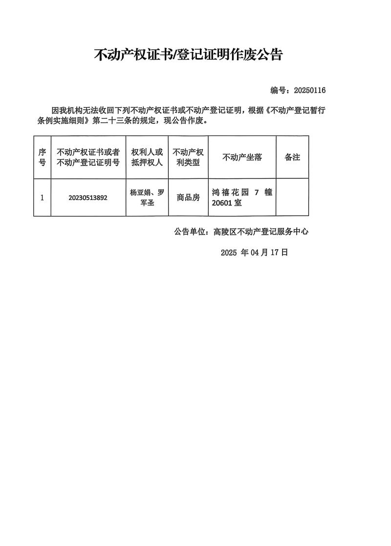 楊亞娟、羅軍圣不動產權證書/登記證明作廢公告,編號:20250116