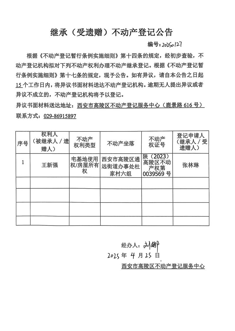張林琳繼承(受遺贈(zèng))不動(dòng)產(chǎn)登記公告,編號(hào):20250127