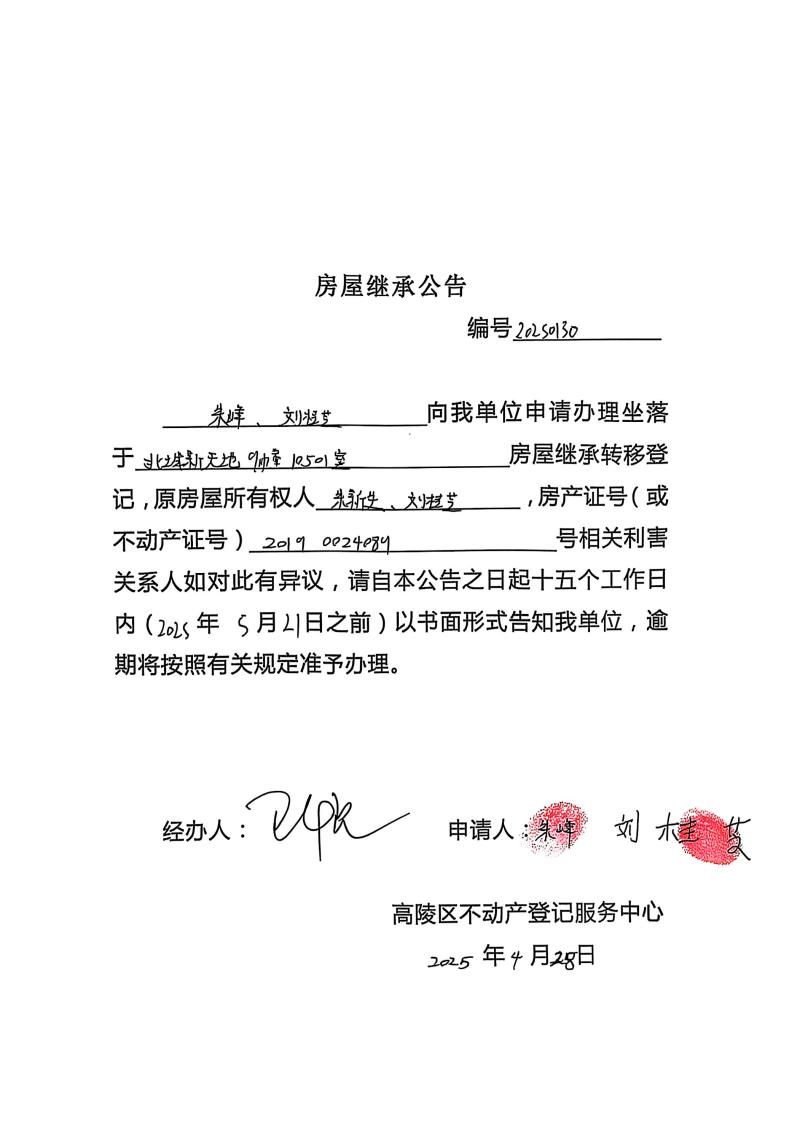 朱峰、劉桂芝房屋繼承公告,編號:20250130