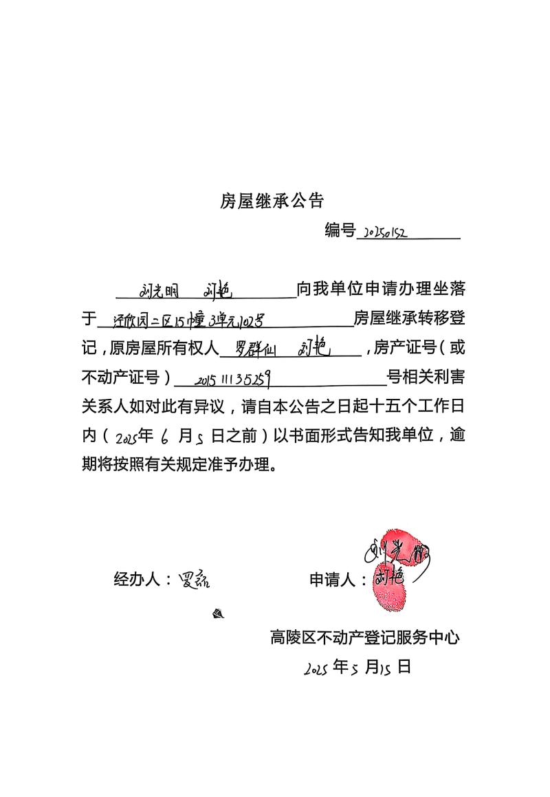 劉光明、劉艷房屋繼承公告,編號:20250152