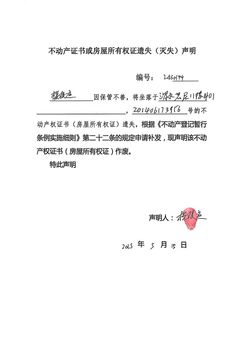 楊根運不動產證書或房屋所有權證遺失(滅失)聲明,編號:20250144