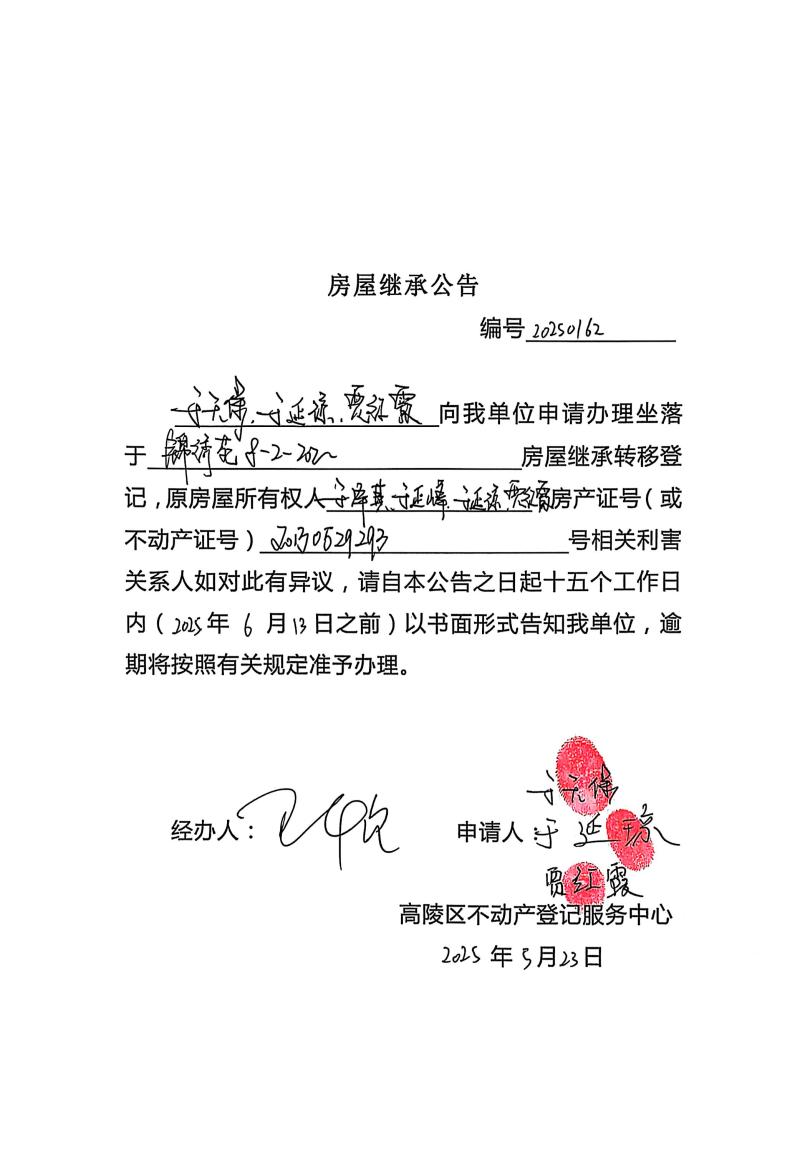 于天保、于延瓊、賈紅霞房屋繼承公告,編號(hào):20250162