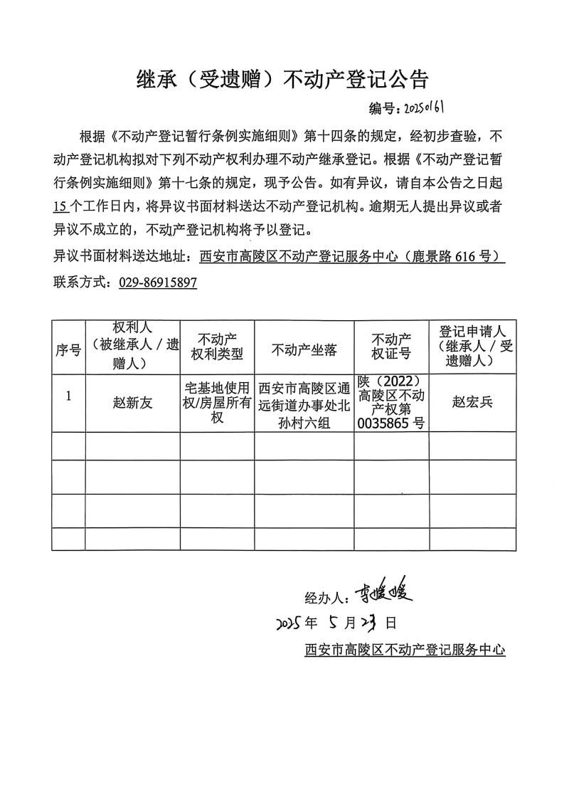 趙宏兵繼承(受遺贈)不動產登記公告編號:20250161