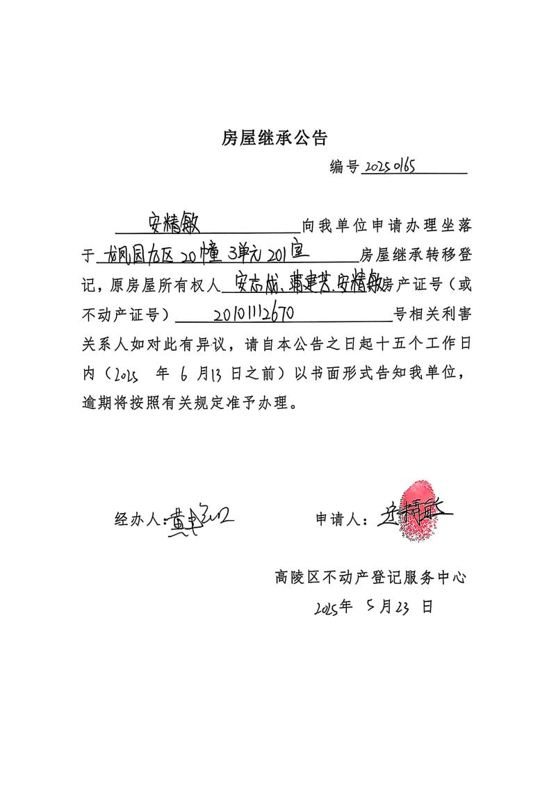 安精敏房屋繼承公告,編號:20250165