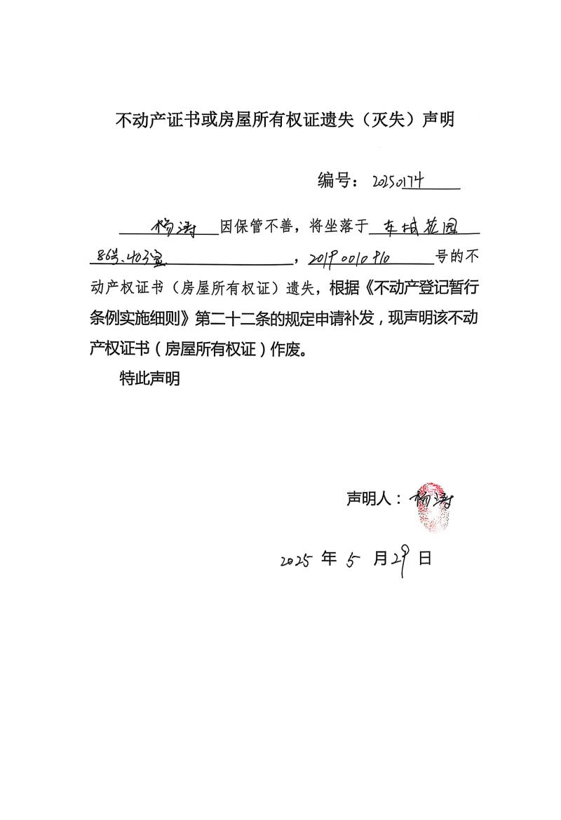 楊濤不動產證書或房屋所有權證遺失(滅失)聲明,編號:20250174