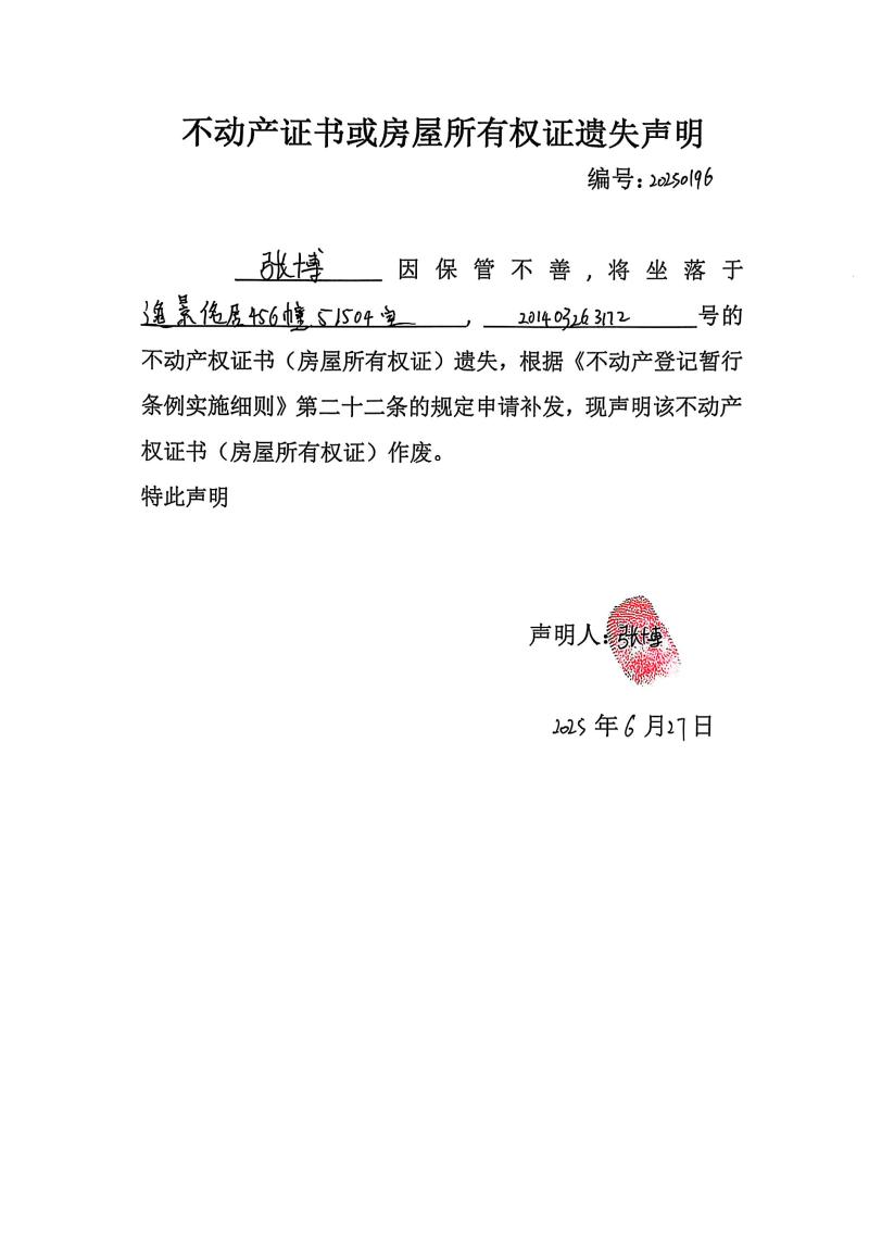 張博不動產證書或房屋所有權證遺失聲明,編號:20250196