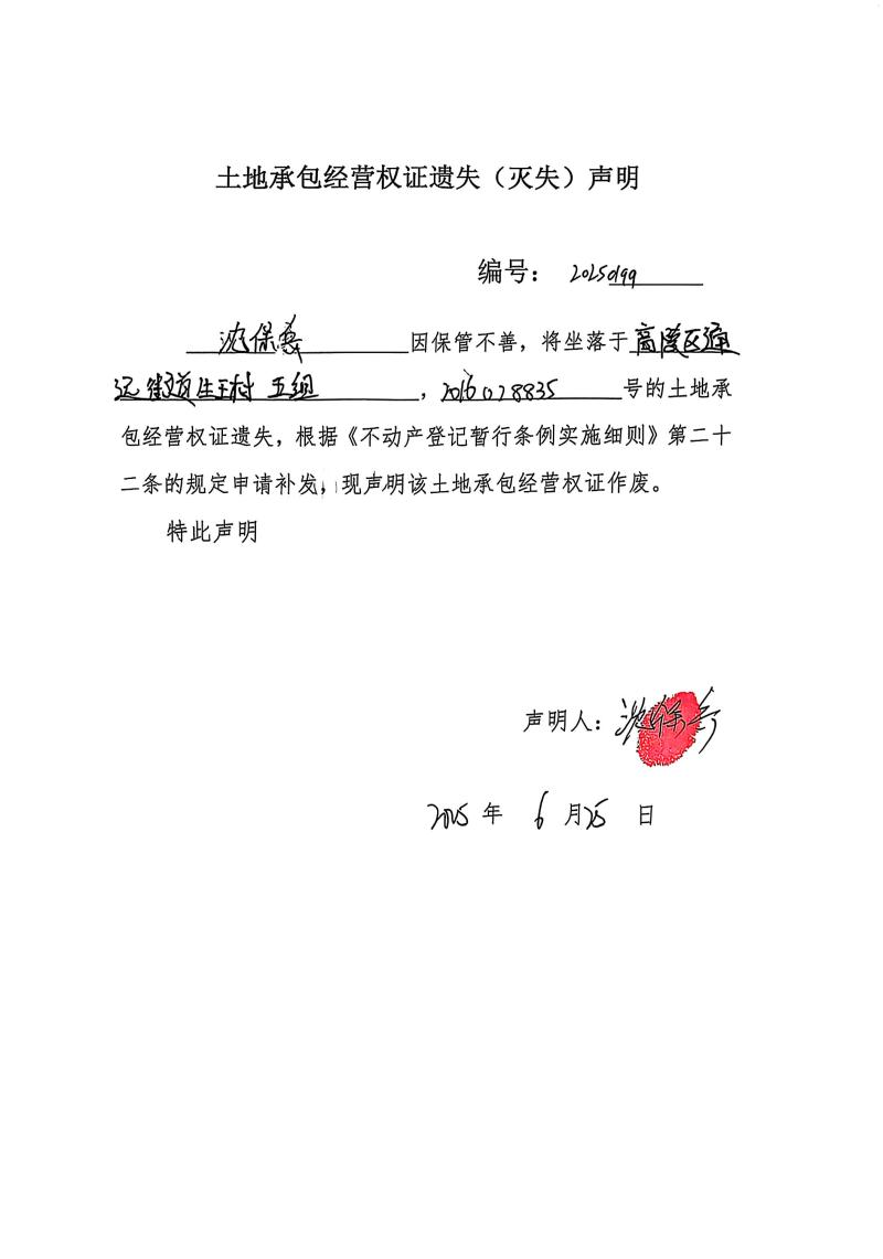 沈保兵不動產證書或房屋所有權證遺失(滅失)聲明,編號:20250199