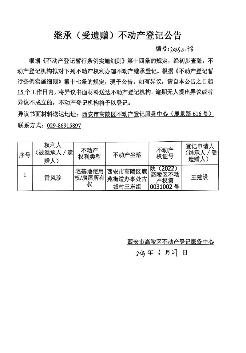 王建設(shè)繼承(受遺贈)不動產(chǎn)登記公告,編號:20250198