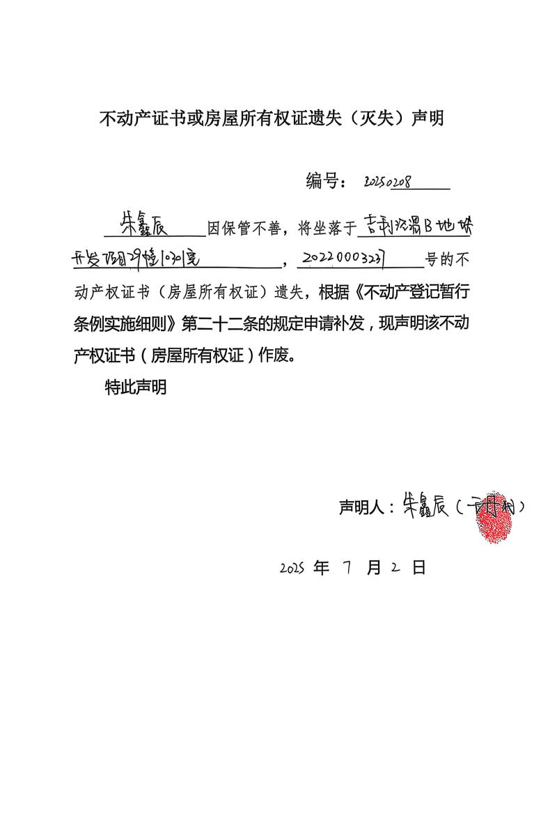 朱鑫辰不動產證書或房屋所有權證遺失(滅失)聲明,編號:20250208