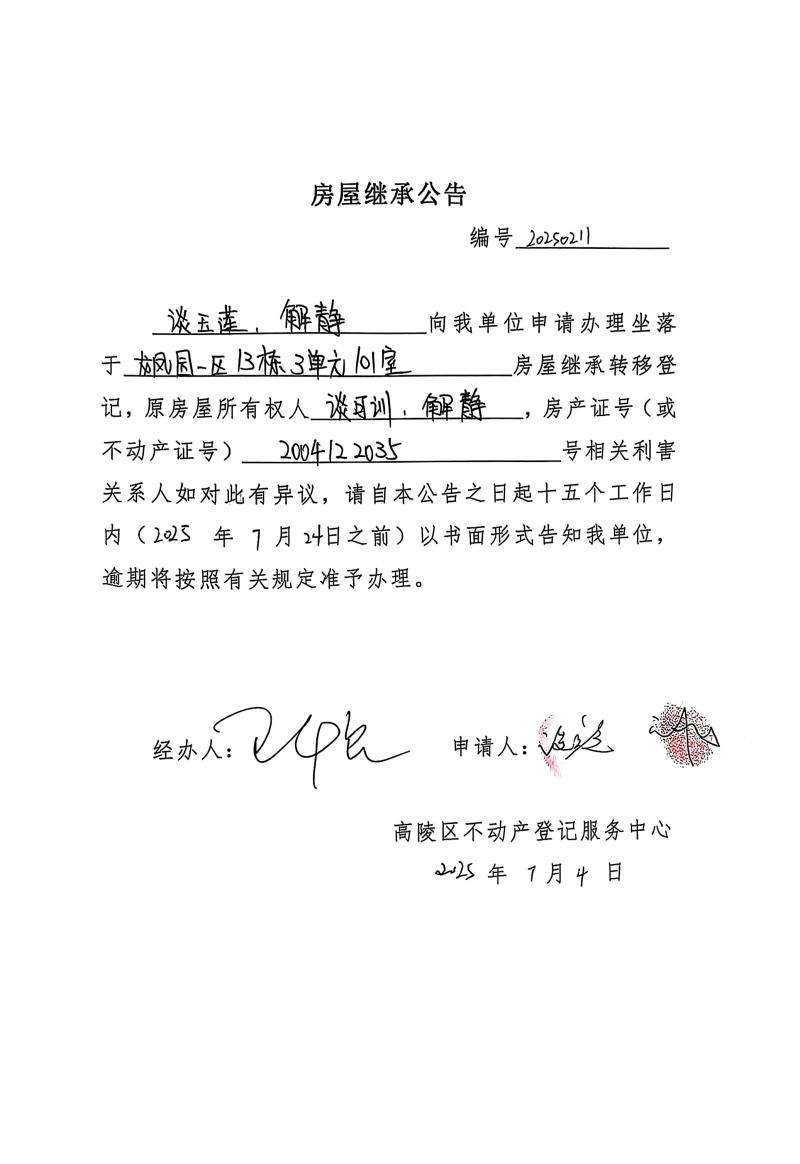 談?dòng)裆彙⒔忪o房屋繼承公告,編號:20250211