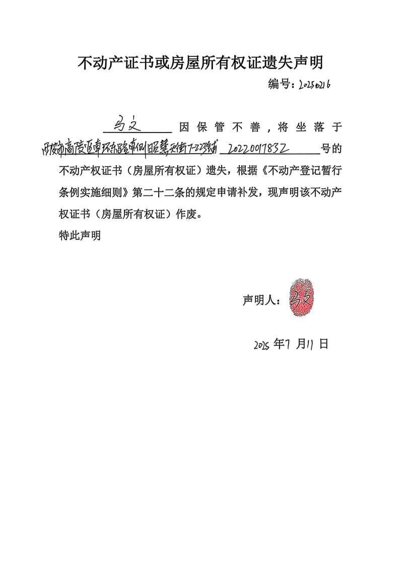 馬文不動產證書或房屋所有權證遺失聲明,編號:20250216