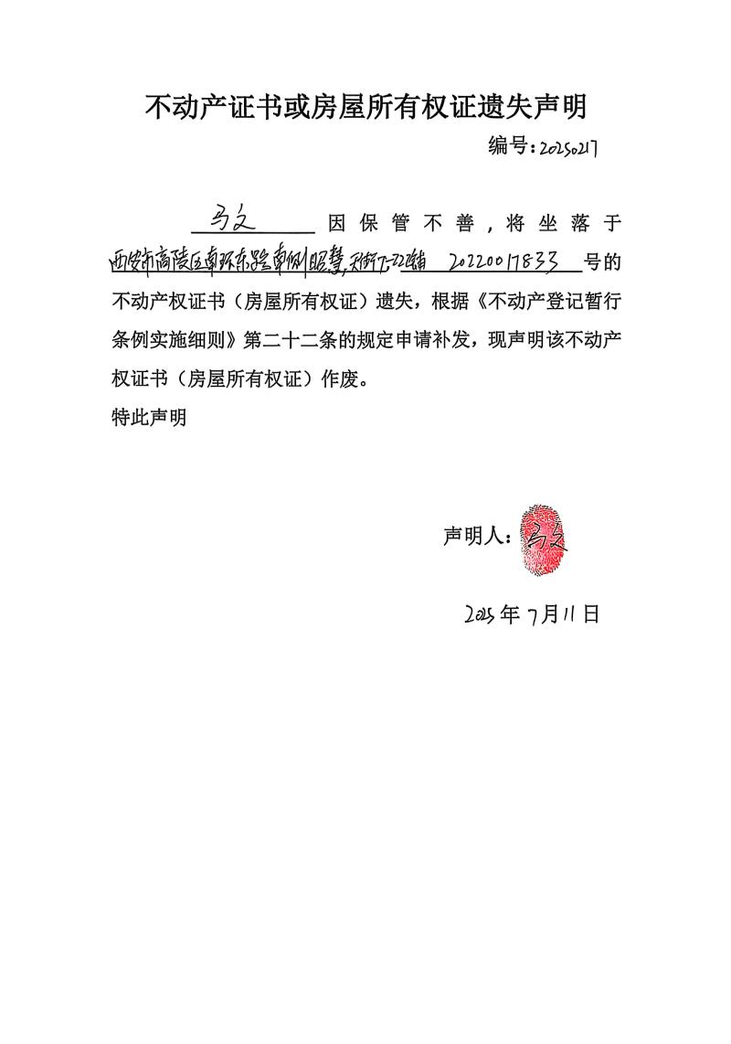 馬文不動產證書或房屋所有權證遺失聲明,編號:20250217