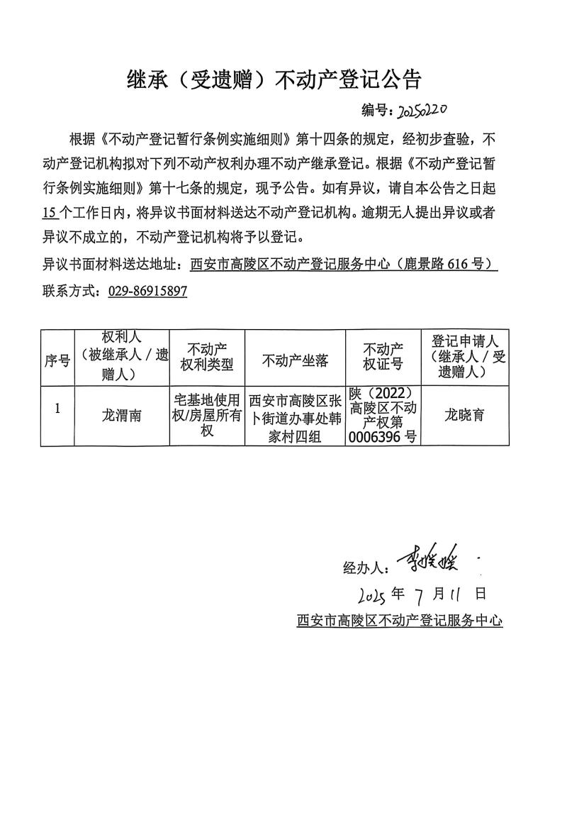 龍曉育繼承(受遺贈)不動產登記公告,編號:20250220