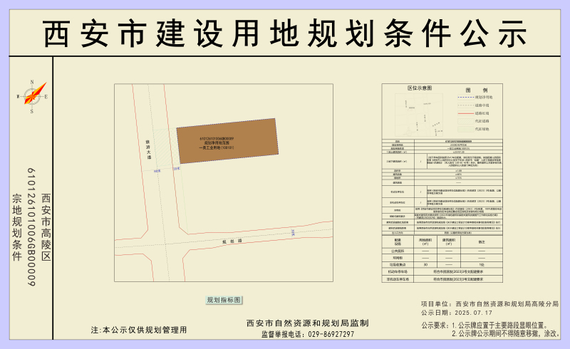 610126101006GB00009號國有建設用地位于高陵區旅游大道以東、土地儲備用地以西、土地儲備用地以北、土地儲備用地以南。凈用地面積約34.996畝。用地性質為一類工業用地(100101),容積率≥1.08,建筑系數≥40%,綠地率≤15%。停車位嚴格按照《西安市自然資源和規劃局關于印發西安市建設項目停車位配建標準的通知》(市資源發〔2023〕3號)配置,充電樁車位按照省市相關文件規定要求配建。配套設施:垃圾收集點1處,用地面積30㎡。