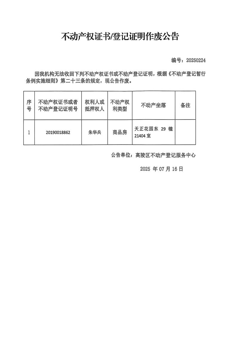 朱華兵、王麗不動產權證書/登記證明作廢公告,編號:20250224