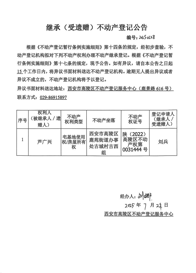 蘆廣興繼承(受遺贈)不動產(chǎn)登記公告,編號:20250228