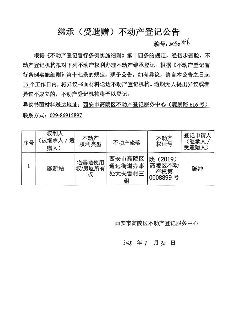 陳沖繼承(受遺贈)不動產登記公告,編號:20250246