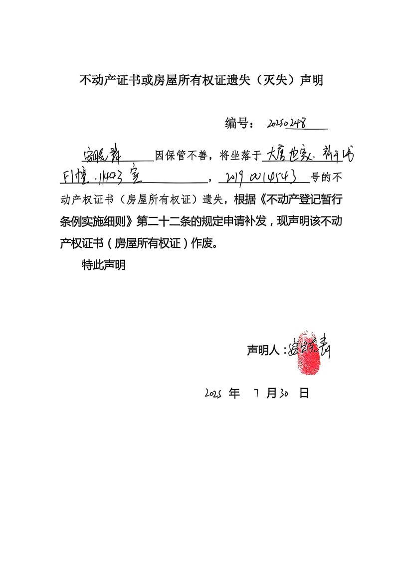 安曉青動產證書或房屋所有權證遺失(滅失)聲明,編號:20250248
