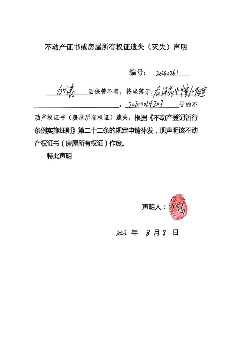 加濤不動產證書或房屋所有權證遺失(滅失)聲明,編號:20250261